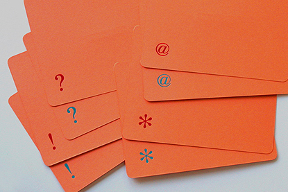 What can you use these for? Glad you asked. Although these fall under "everyday" cards, there is a method to our madness. Use @ to let your friends know when/where to meet (or as party invites!); * as a footnote to a previous letter or conversation; ! when you have awesome news to share (or a juicy rumor); and ? for, well, you know. Eight cards on mandarin stock foil stamped in red and teal with cool aqua envelopes.